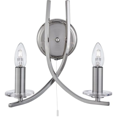 A wonderfully charming wall bracket featuring 2 lights and an attractive satin silver twist frame. The round base of Ascona is wall mountable and is attached to the 2 part cross over frame. Two clear glass sconces sit on each side of fitting and the visible bulbs provide a clear projection of light. The wall bracket is operated using a white pull switch. Match with item: 4165-5SS.