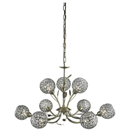 This Bellis II antique brass 9 light pendant with clear glass shades and leaf decoration makes an imposing centrepiece for any bedroom, living room, dining room or kitchen ceiling. This ornate antique brass finish fitting is beautifully crafted, with leaf decoration and nine clear glass and antique brass flower head spheres, which refract the light around the room beautifully.