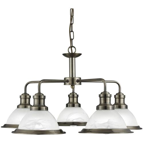 This Bistro antique brass 5 light ceiling fitting with acid glass shades has a simplistic look that will add a retro feel to any dining room or kitchen. Reminiscent of the style of classic diners and bistros, the ceiling light comprises of five classic art deco shades finished in a traditional antique brass, with acid glass to provide clean lighting effects. This ceiling light brings a distinctive and elegant style to any setting, and the chain can be adjusted for different ceiling heights.