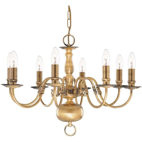 This Flemish solid antique brass 8 light chandelier with candle style light fittings brings an air of grandeur to any expanse in your home. The ornate chandelier has eight candle style lights and a traditional finish. The fitting has curved arms and an ornate central mast with a large bulbous, antique brass head at its base. It also has a chain suspension, which allows you to adjust it to the perfect ceiling height.