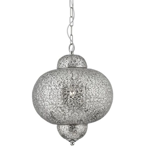 This Moroccan style Fretwork pendant light will make a real style statement in any home. Finished in shiny nickel with a patterned circular design and a pointed base, this ceiling fitting is perfect for over table lighting in a dining room or kitchen. The Moroccan light is punctured so the light projects through brightly causing slight patterned shadows