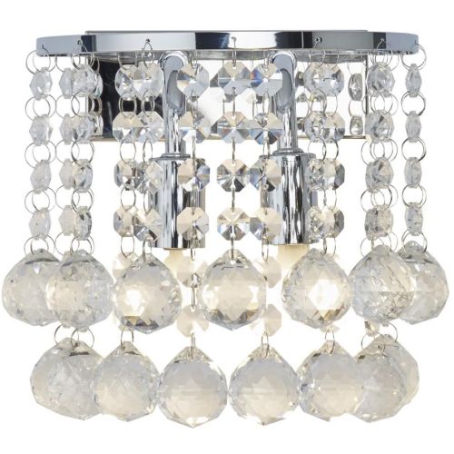 This Hanna chrome 2 light round wall bracket with crystal balls looks stunning on any wall. The luxurious fitting features two lights surrounded by cascading crystal buttons and spheres, which hang decadently from a sleek chrome finish ring. This modern fitting looks beautiful by day or night.