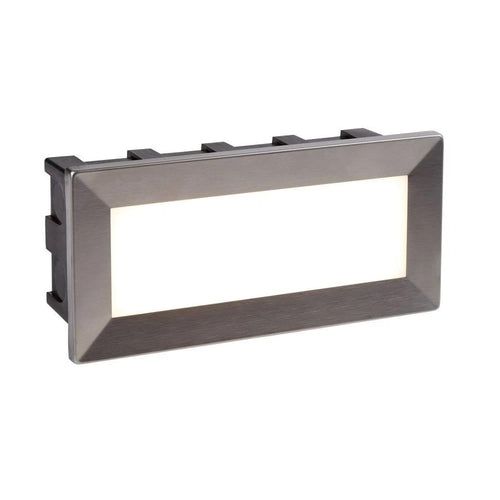 The Searchlight 0762 is a LED outdoor recessed brick light that features a rectangular aluminium frame in stainless steel finish with an opal white diffuser and provides cool white LED illumination. The brick light which sits discretely in the wall can be used to bring light to garden pathways or steps. This item is IP65 and it fully protected from dust and water sprays from all directions.