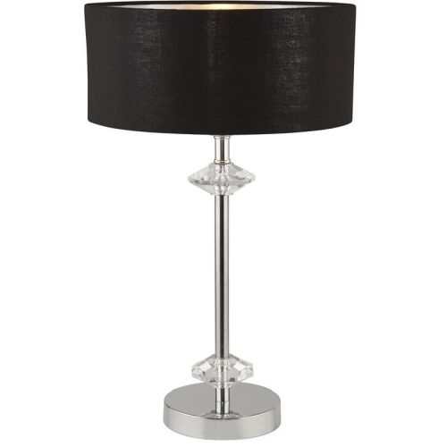 The New Orleans table lamp has a chrome finish, complemented by a shiny black fabric shade with a silver lining. Incorporating an acrylic gem on the stem. This sleek product is great for updating an interior space.