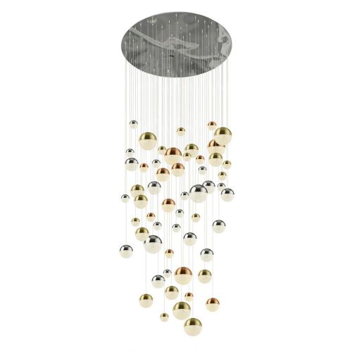 The stunning Planets pendant has a rounded chrome ceiling plate that holds 55 stunning multi-drop balls with copper, chrome and satin brass finish; then detailed with crystal sanded shades. Planets will add a statement to any high ceilinged room with its visual impact. The integrated LED pendant also features a height adjustable cable and dimmer switch. LED’s use up to 75% less energy and last up to 20 times longer than incandescent bulbs.