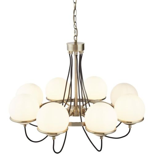 Make a statement in your living room using this distinctive 8 light Sphere ceiling fitting. Complete with opal white glass and antique brass, the item has a nostalgic and vintage feel to it. The ceiling light is given a modern update as the black braided cable detail covers the body and suspends beneath the lights.
