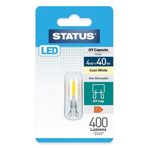 STATUS LED 4w = 40w = 400 lumens – Status – LED – G9 Plastic – Cool White – non dimmable – 1pk in a trapped box – in a white CDU