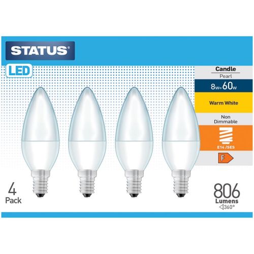 8W = 60W 806 lumens LED Candle SES/E14 Pearl Warm White/2700k Pack of 4