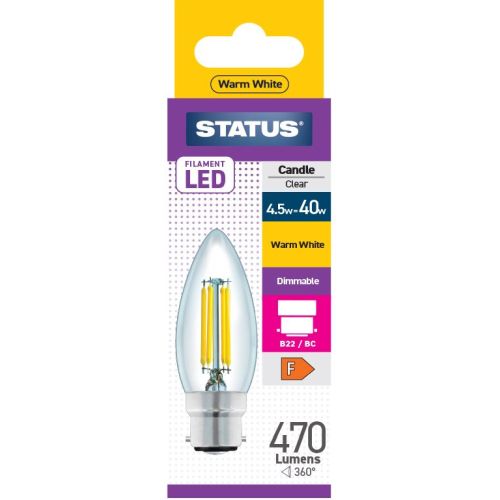 STATUS LED FILAMENT CANDLE 4.5W=40W BC DIM CLEAR W/W