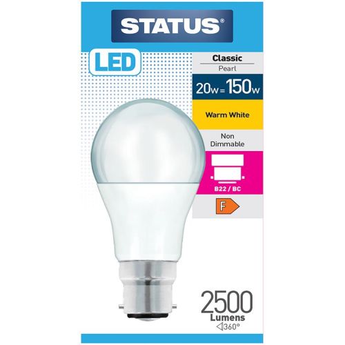 19w = 150w = 2500 lumens – Status – LED – A80 GLS – B22 – PA -Pearl – Warm White – 1 pk box – in White CDU