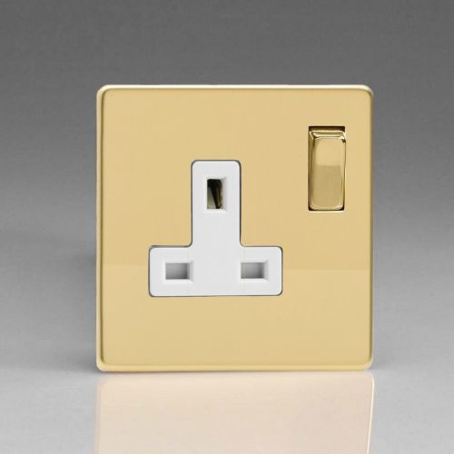 VARILIGHT POLISHED BRASS SCREWLESS 1G 13A SOCKET WHITE INSERT